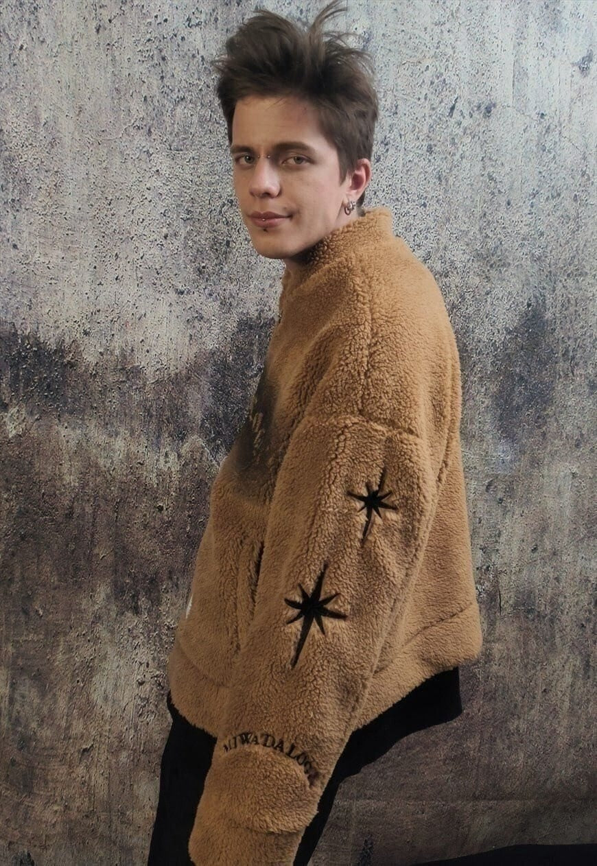Graffiti fleece varsity jacket fluffy punk bomber coat brown